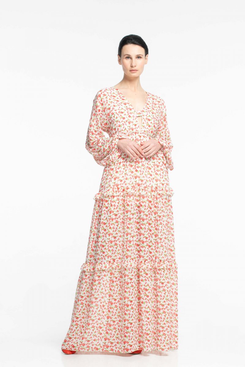 Красивое платье из воздушной ткани привлекает внимание. Цветочный принт дополняет образ романтичностью и дарит нежные ощущения. Хорошо садится по фигуре благодаря приталенному крою. Скрывает полноту за счет многослойности ткани. Красивое оформление декольте позволяет носить такое платье без топа и лифа. Летом достаточно обуть сандалии и надеть шляпу с широкими полями. Зимние варианты выхода в этом платье могут быть разнообразны, например, в сочетании с теплыми колготами, объемными свитерами и обувью в разных стилистических направлениях. «А Lot» предлагает такой наряд в нескольких вариантах.