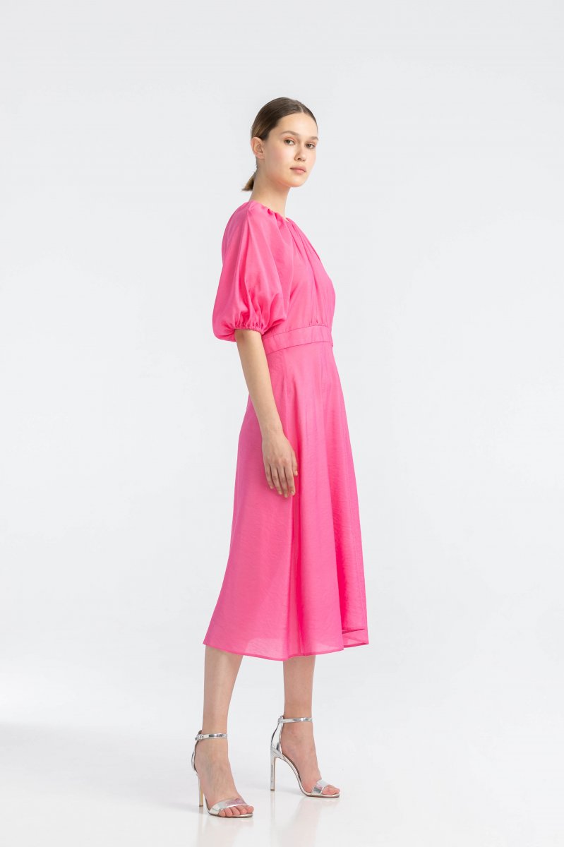 Легкое розовое платье из вискозного батиста ниже колена с рукавом-буф, поясом, проймой лодочкой и молнией на боку.