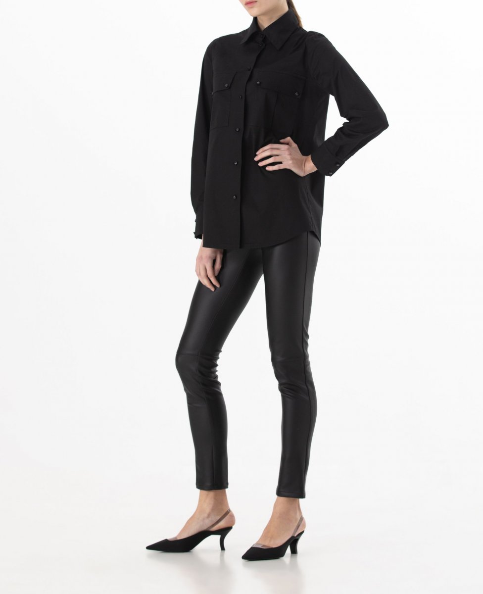 Черная хлопковая рубашка свободного кроя с небольшим отложным воротником на стойке и длинным втачным рукавом. Спереди присутствуют два массивных кармана. Композицию завершают манжеты средней ширины, качественные лекала обеспечивают удобную посадку.