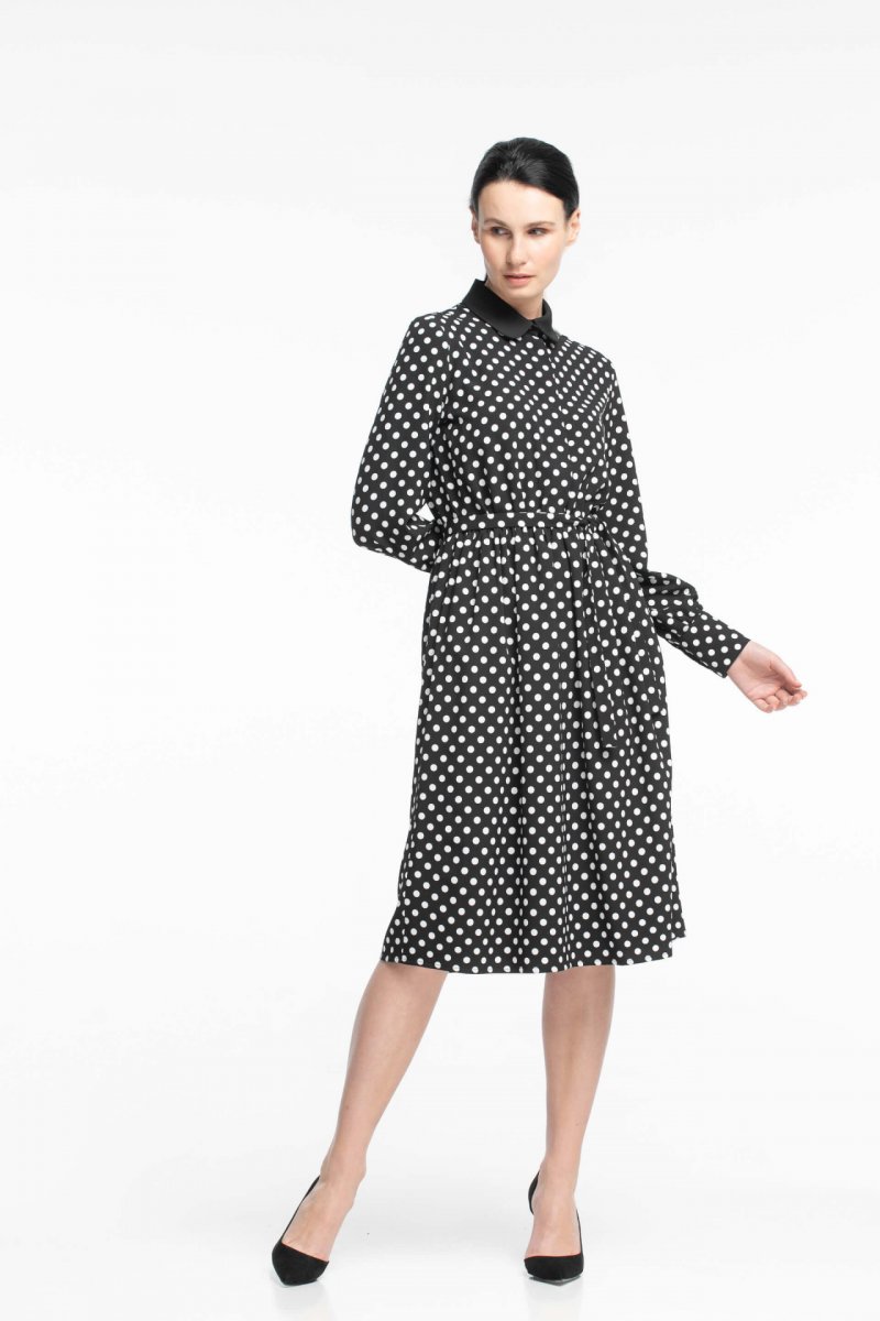 Чорна шифонова сукня в білий горошок з поясом, який підкреслює талію на резинці. Закруглений комір, що переходить в закриту планку, додає образу особливої ніжності, а високий манжет завершує композицію. Жінкам потрібні легкі вироби, щоб відчувати себе по-справжньому жіночною. Це шифонове плаття буде надавати Вам особливої легкості від теплого весняного вітру.