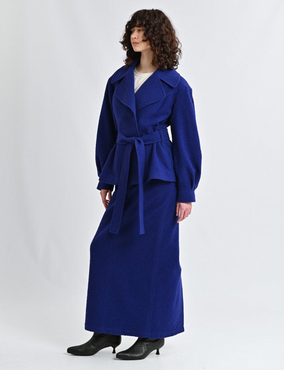 Синій пальтовий піджак під пасок