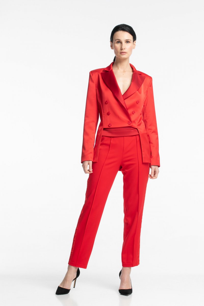 Предмет чоловічого гардеробу для виходу в світ давно придбав популярність і у жінок. Сміливі поєднання дозволяють створювати пікантні образи для урочистого вечора, неформальної зустрічі та просто прогулянки в стилі casual. Пропонується як в костюмному варіанті з брюками, так і соло варіант у поєднанні з кюлотами, шортами або приталеними сукнями. Не варто поєднувати з іншими предметами чоловічого гардероба. Взуття обирається в залежності від вашого образа.